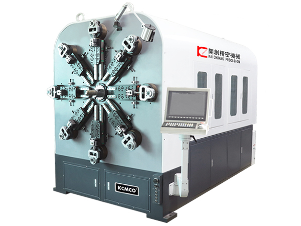 開創(chuàng)KCT-1260WZ十二軸無凸輪數(shù)控萬能彈簧轉(zhuǎn)線成形機利用臺灣Windows7操作控制系統(tǒng)、引用日本進口安川伺服電機,采用獨特的無凸輪和無搖臂設計,刀架由八組伺服馬達獨立控制,其中刀架八軸、送線一軸、轉(zhuǎn)芯一軸、轉(zhuǎn)線一軸和卷曲一軸,其統(tǒng)成由曲柄連桿成形系統(tǒng)、送線系統(tǒng)、轉(zhuǎn)線系統(tǒng)、校直系統(tǒng)和轉(zhuǎn)芯系統(tǒng)等組成。此外,該機型可配帶液壓剪刀裝置,切割噪音小,對芯棒及機器的損害為零;同時也極大的提升了彈簧加工范圍,不僅具有成形快、精度準和性能穩(wěn)等特點,而且調(diào)機更方便,易操作。